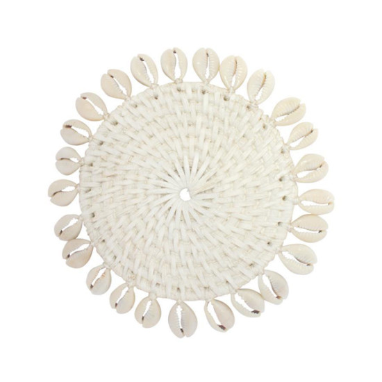 Round Rattan Drink Coaster White With Shell