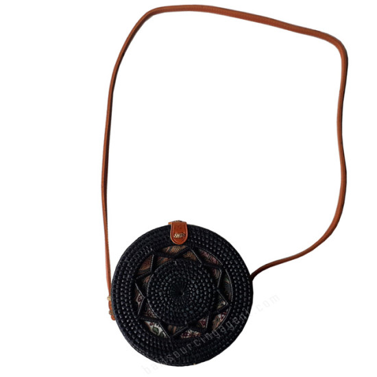 Rattan Purse Handbag Circle Long Strap Black