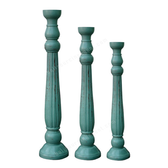 Wooden Pillar Candle Holder Light Blue Finish Set Of 3