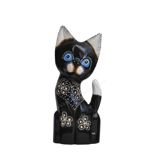 Wooden Dwarf Cat Black White Carved Flower
